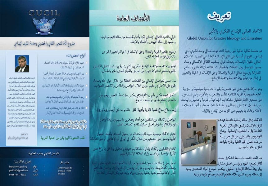 أصدر الاتحاد العالمي للإبداع مطوية “بروشور” تعريفية بالاتحاد وأهدافه ووسائله طبعت بمستوى فاخر ومضمون مفيد وتوزع مجانا على كل راغب في التعرف على الاتحاد وأهدافه وآليات العمل ووسائل التنفيذ. وسيتم توزيع هذه المطويات في كل مؤتمر أو مهرجان أو مناسبة متعلقة بالاتحاد العالمي للإبداع، ونرفق لكم هنا صورا من هذه المطوية.